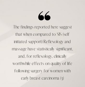 1 in 3 people will experience cancer in their lifetime and it goes without saying that diagnosis, reality of different medical interventions and the instant and ongoing impact on every day life can be overwhelming and incredibly stressful for all involved. I believe that Reflexology can be an incredible complementary support at this time, offering an opportunity for a moment of peace and comfort in a mentally and physically challenging, clinical situation. It is my hope that research into the value of Reflexology within cancer care increases in the years to come, enabling provision of well deserved respite to patients and their loved ones on a much larger scale. Studies already carried out (though small) have drawn some positive conclusions: